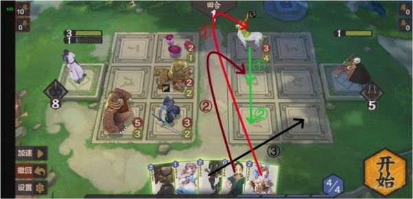 本关需要巧妙使用法术。通过对局势的观察发现,我们必须从上路或中路破敌,同时3灵和4灵法术消耗太大,肯定不能使用。所以应当从其他的法术卡里想办法,如果要从上路破敌,显然是不现实的,因为至少需要在后排放上两张卡,导致卡不够用,所以采取中路破敌,上路就利用某张法术将(233)推上去,中路利用某张法术将(131)推上去同时在场的一张法术保证其不死,同时将(444)抵挡住又需要一张法术(注意幼时之盟会抽卡暴死,所以一定要在其翻开之前结束战斗,指定随机),思路如下: