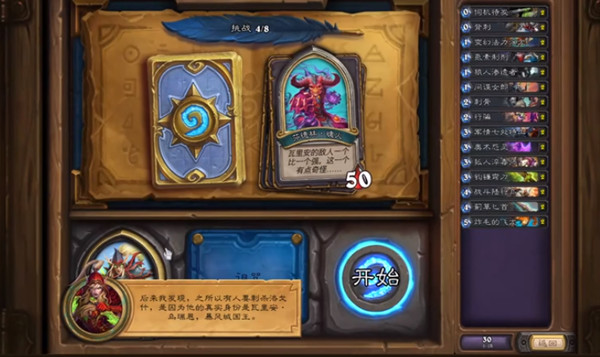 对面的英雄技能是3费从牌库中装备一把武器并使其获得+1攻击力。AI似乎会倾向于和玩家抢脸,所以玩家的起手最好要找一下节奏比较顺畅的,就很容易过了。