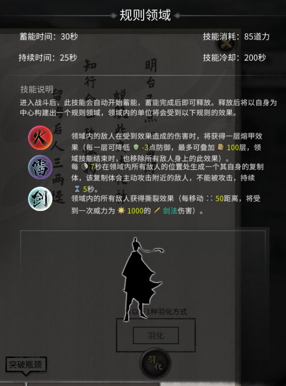 领域技能特效: 每1秒燃烧10%灵力,每1点灵力增加威力7。
