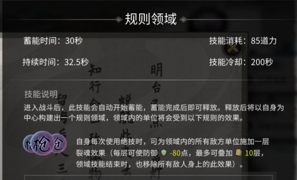 领域技能特效: 护心降低80%、被暴击的敌人损失15%当前灵力。