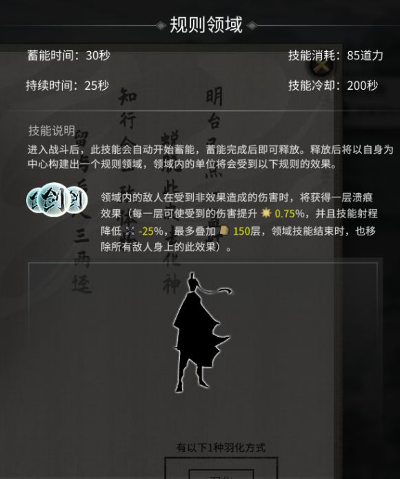 领域技能特效: 每层使受到的伤害提升0.75%,一共150层、并且降低技能射程25%。