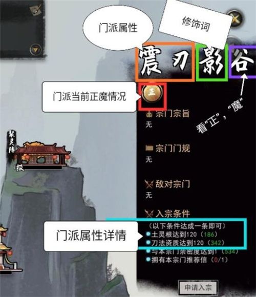 比如说“震刃影谷”,前两个字“震”和“刃”就对应了“土”和“刀”,想练刀和土的道友就可以进这个门派。