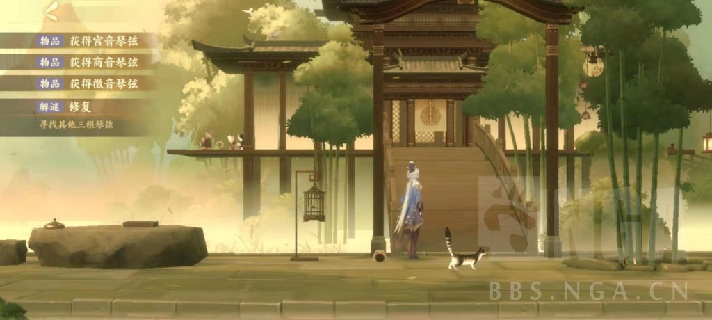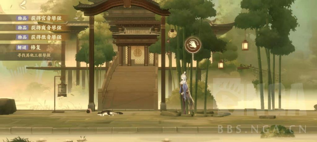 回到梦境,在鸟笼旁边的灯笼上得到宫音琴弦。梦境竹林里得到羽音琴弦。