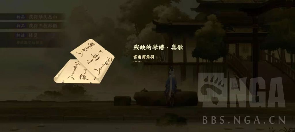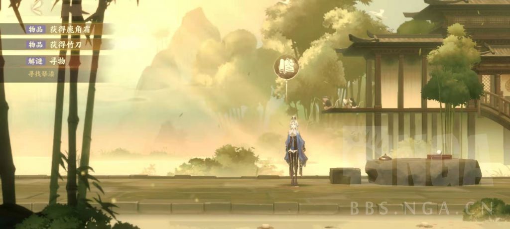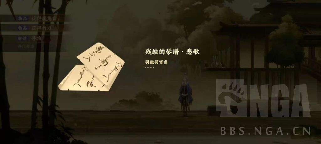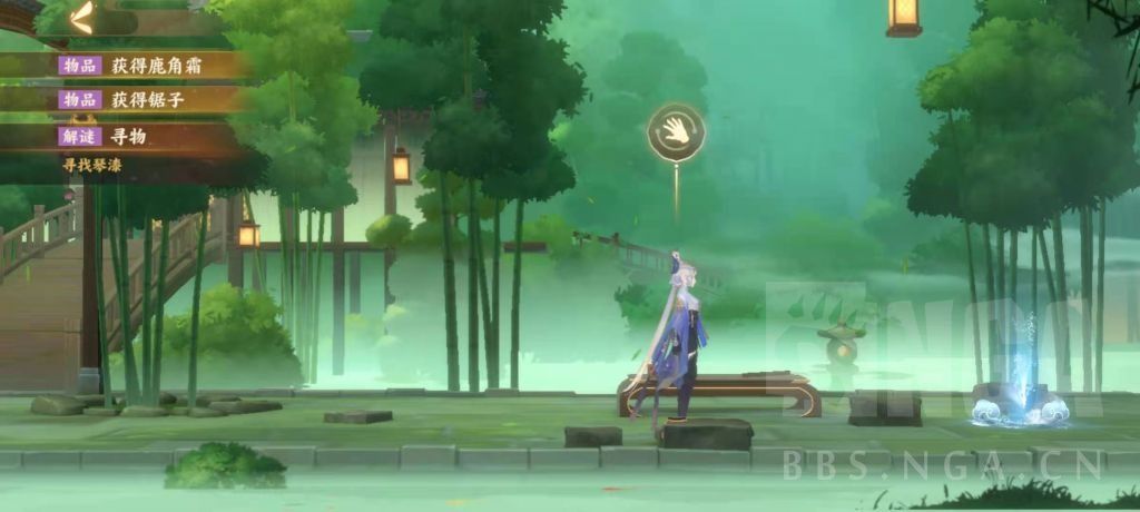 忘川中:比翼鸟断断续续歌唱,在鸟笼周围获得宫音灯笼,石桌上找到竹刀,去右边竹林,可获得羽音灯笼。