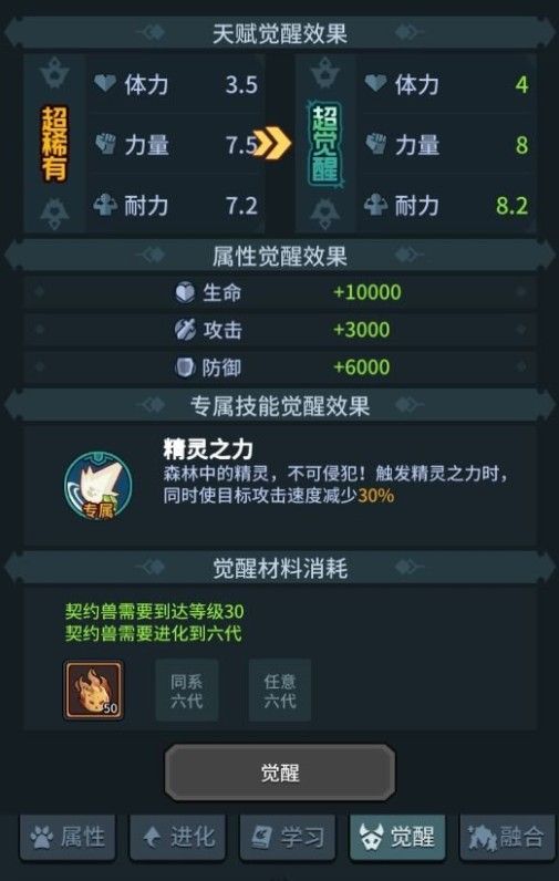 宠物详情页的觉醒功能解锁,这里的要求材料觉醒意志在图四和之后的boss都有概率出,现在开金罐子也有概率,属于比较花时间后期的玩法,有些宠物觉醒后的专属技能会比原来厉害很多,大家看自己的选择,或者有时间再做一篇详细的宠物攻略,这里就不详谈了~