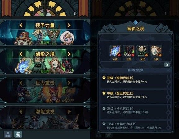 这也算新版本的一个新系统吧,其实就是一个出战契约兽的加成系统,凑够条件所需要的种类契约兽即可获得相应加成,可以说是前期一个额外的正向buff吧~