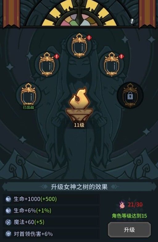 首先是一进去界面的女神之树,通过升级很直接的加成人物本身的属性和对领主伤害,而升级用的材料来自水柱洞窟的派遣,良心无消耗,挂机就完事儿了,升上去准没错!