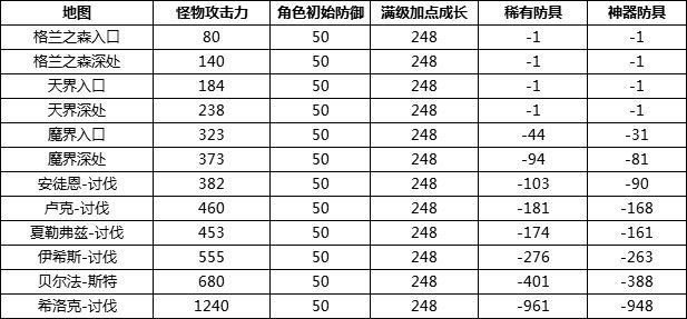 以下放个怪物攻击参考表,然后满级全点防御情况下,各怪物对穿戴稀有/神器防具角色造成的伤害: