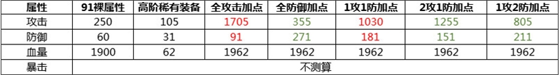 由此得出全攻/全防御搭配全高阶稀有套的模板,暴击因浮动太大,所以不测算。