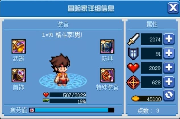 再拿男格斗作为标本,目前91级,正好获得了90点的自由属性点。扣除剩余未点的两点和分配到1点防御上的属性,实际87点全部点了攻击力。