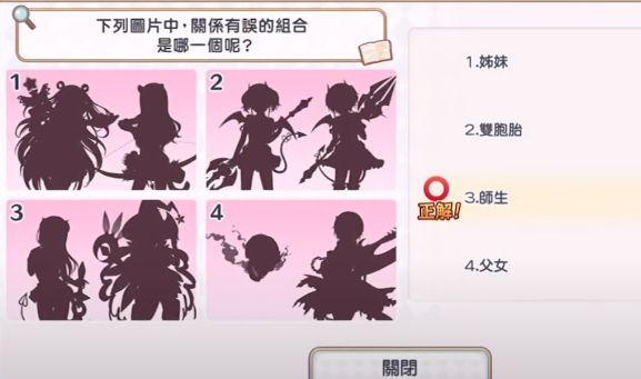 1的剪影是初音和栞,姐妹没问题;2的剪影是茜里和依里,双胞胎也没问题;4是忍和骷髅老爹,不知道骷髅身份的玩家建议去看看忍的【亡灵召唤】技能说明;3是伊绪和七七香,俩人没有特殊关系。所以答案是3。
