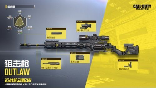 Outlaw的战术特点与功能性都非常出色。转轮供弹设计、造型前卫等,但只有高机动性和灵活性才是Outlaw最大的特色。对于狙击枪来说,高机动性将赋予战局更多的可能,除了远点部署、百里制胜,Outlaw还为冲锋狙打法提供了更优解法。