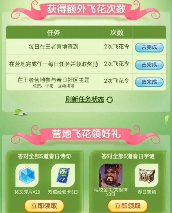一个挑战是答春日诗句,另一个是猜春日字谜,小编个人建议大家通过第一个挑战来获得奖励,会的诗句直接将字填进去,不会的就百度一下,不过这个百度就很浪费时间了,要是大家不想浪费时间可以通过第二个挑战答字谜完成,每一题都是和王者荣耀英雄有关的,而这些题目的答案小编会在下面告诉大家,你们不用寻找每一题的答案,看小编的文章即可了解。这里需要注意你们的挑战次数,也就是飞花令次数每天只有五次,机会用完就没有了,不过可以通过上面图片的方式获得额外的飞花令次数。