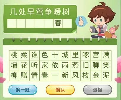 答春日诗句:玩家可从给定字库中选择正确的文字填充完整诗句;