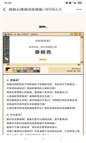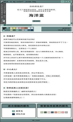 这个测试操作也很简单,只需要进入地址后进行各类不同的互动即可快速知晓答案,更快的知晓你到底是属于什么样的颜色,了解不同的互动服务更全面。通过测试让你了解到最真实自己的性格测试软件,可以说你的样子都能展现出来,一些解读的东西,还有让你更加深刻的选择, 都是值得我们去探讨的问题,大家在测试的时候,一定真实,不然结果可能有点的出入,但是这种玩法也就是看看而已。