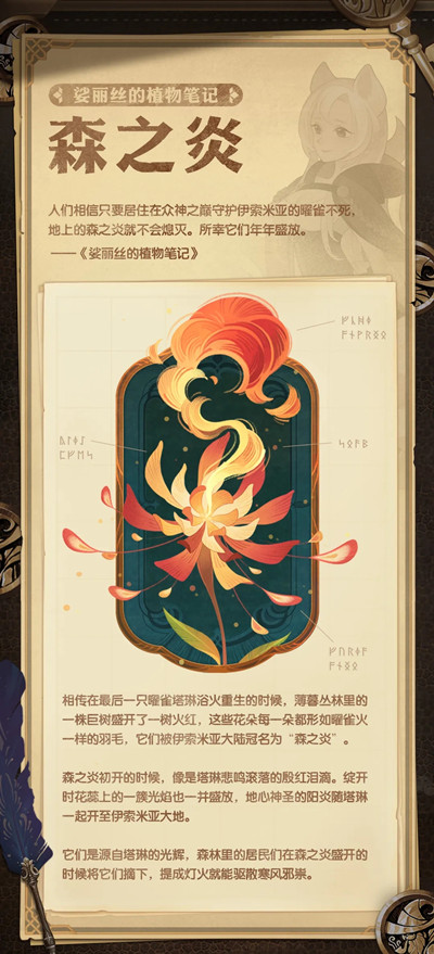 相传在最后一只曜雀塔琳浴火重生的时候,薄暮丛林里的一株巨树盛开了一树火红,这些花朵每一朵都形如曜雀火一样的羽毛,它们被伊索米亚大陆冠名为“森之炎”。