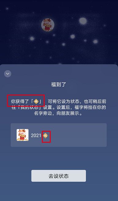 许愿完毕会获得一个「福」字,在【点亮 2021 】主页面下出现一个【福】字图标。可以将它设为自己的状态,发布一条带有【福】字的状态,这个「福」就会出现在微信名旁边。