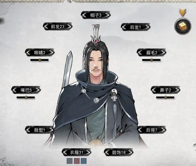 前发:25、后发:2、眉毛:2、鼻子:2、脸型:2、嘴巴:5、眼睛:5、帽子:3、脸饰:13、衣服:31、后背:7