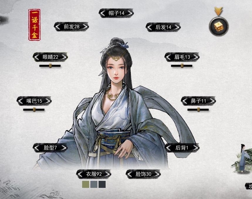 帽子14、后发14、眉毛13、鼻子11、后背1、脸饰30、衣服92、脸型7、嘴巴15、眼睛22、前发28。