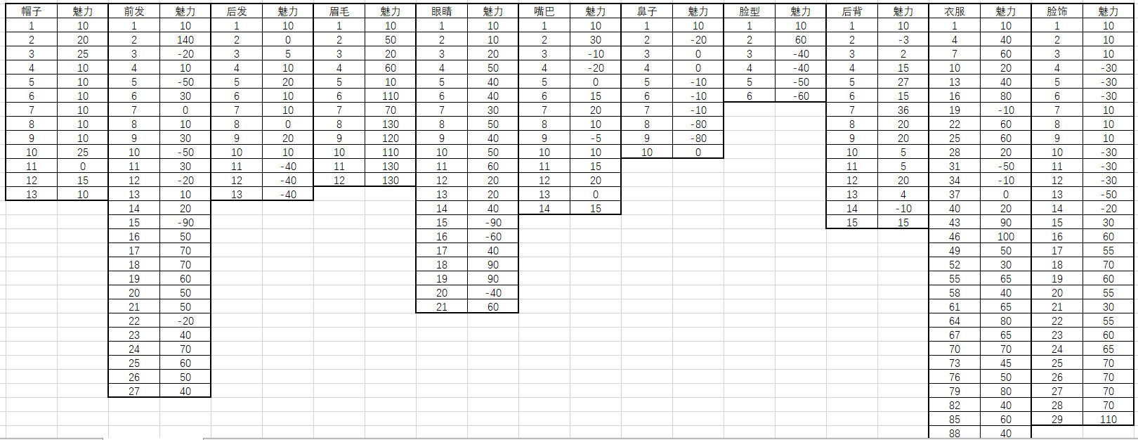 选择的号数不同,人物形象的外观也就不同。在11个部位中,只有4个部位有可替换的部位,剩余7个部位的号数均为魅力值增加最高的号数。