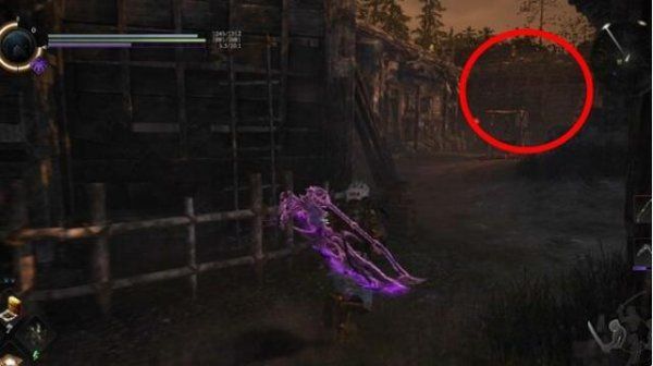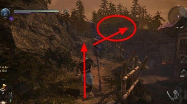拾取后,通过之前杀蛇女的木桥,打开木门,回到神社,从神社另一边走,红圈的房子房顶有一个魑魅。