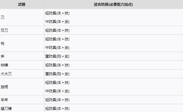 根据武器不同,适合的防具也就有所区别,在选择防具时可以参考下方表格。