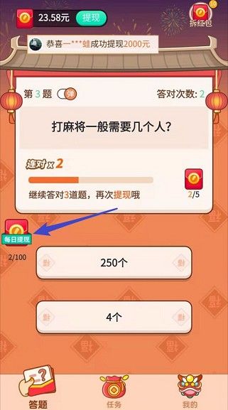 游戏中不仅可以通过答题来赚钱,还可去完成相关任务获得奖励!