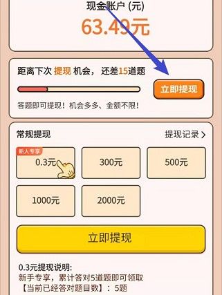 不过提款有限制的,新手专享0.3元,需要答对5道题即可领取;