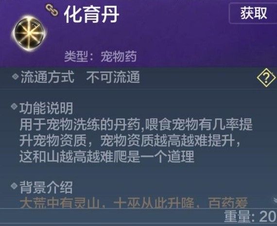 化育丹俗称的资质丹,别乱用!完成任务系统会送或者完成“游戏机”里的吞噬游戏,也可以商城买。