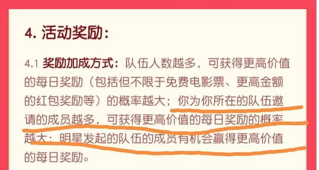 奖励加成方式:队伍人数越多,可获得更高价值的每日奖励(包括但不限于免费电影票、更高金额的红包奖励等)的概率越大;你为你所在的队伍邀请的成员越多,可获得更高价值的每日奖励的概率越大;明星发起的队伍的成员有机会赢得更高价值的每日奖励。