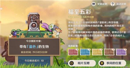 原神福至五彩活动的第二天,玩家要找到带有蓝色的采集物进行拍照,所以带有蓝色生物的位置大家一定要快速找到,下方是本站小编带来的攻略,其中就有蓝色采集物的位置分布介绍,让玩家快速找到拍照地点。