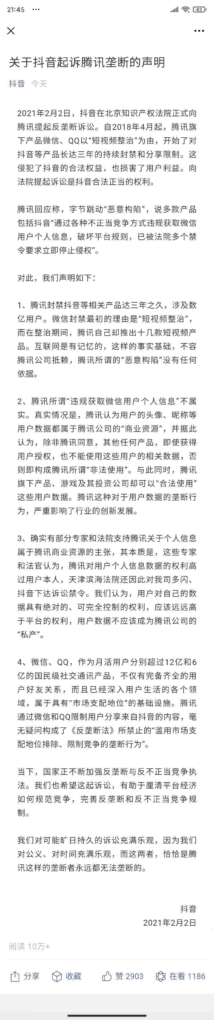 2月2日晚间,针对腾讯认为字节跳动“恶意构陷”的回应,抖音称,用户对自己的数据具有绝对的、可完全控制的权利,应该远远高于平台的权利,不应该成为腾讯公司的“私产”。抖音还称,向腾讯提起反垄断诉讼,原因是自2018年4月起,腾讯旗下产品微信、QQ以“短视频整治”为由,开始了对抖音等产品长达三年的持续封禁和分享限制。抖音认为,这侵犯了抖音合法权益,也损害了用户利益。抖音表示,希望这起诉讼,有助于厘清平台经济如何规范竞争,完善反垄断和反不正当竞争规制。