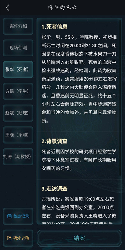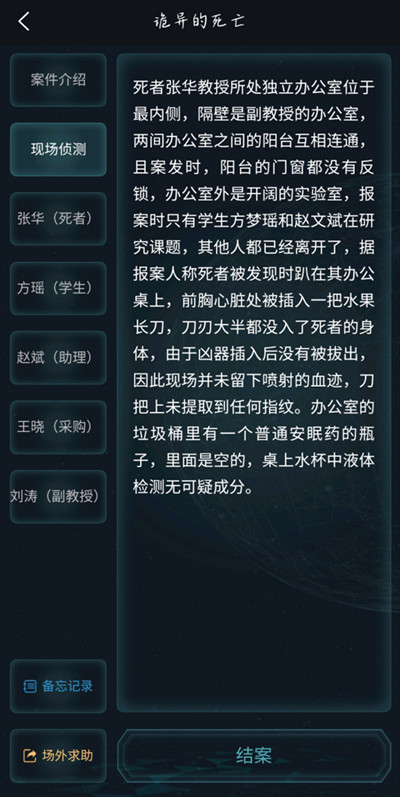 死者张华教授所处独立办公室位于最内侧,隔壁是副教授的办公室,两间办公室之间的阳台互相连通,且案发时,阳台的门窗都没有反锁,办公室外是开阔的实验室,报案时只有学生方梦瑶和赵文斌在研究课题,其他人都已经离开了,据报案人称死者被发现时趴在其办公桌上,前胸心脏处被插入一把水果长刀,刀刃大半都没入了死者的身体,由于凶器插入后没有被拔出,因此现场并未留下喷射的血迹,刀把上未提取到任何指纹。办公室的垃圾桶里有一个普通安眠药的瓶子,里面是空的,桌上水杯中液体检测无可疑成分。