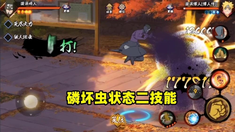 而如果是在磷坏虫状态下释放二技能,就会变成一个体术攻击的效果,并且可以让虫群把对方给包裹起来,这个包裹的形态看起来好像是有抓取,但不确定,需要等到正式上架后才能知晓。另外,在这个形态释放的二技能最后一段还有一个闪现攻击的特性,又有点类似暴怒带土在暴走状态下普攻的最后一段,只不过油女取根是本体砸下来,而暴怒带土是用木遁。