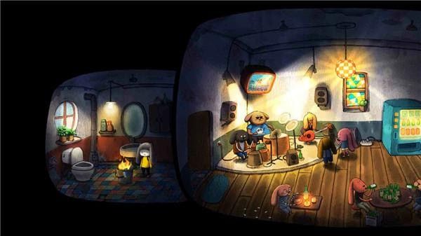进入后,点击左边游戏机,通关小游戏,获得一个游戏币,然后投入旁边的售货机,获得香烟,然后与左下角的兔子对话,得知他要烟,于是把烟给他,然后等他点燃香烟以后,取走打火机,然后与旁边的鼓互动(小游戏),之后打鼓的兔子会给我们一个铁桶