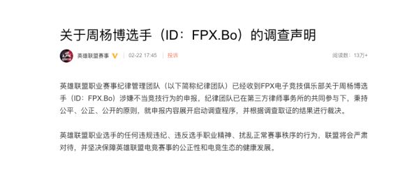 官方原文:英雄联盟职业赛事纪律管理团队(以下简称纪律团队)已经收到FPX电子竞技俱乐部关于周杨博选手(ID:FPX.Bo)涉嫌不当竞技行为的申报,纪律团队已在第三方律师事务所的共同参与下,秉持公平、公正、公开的原则,就申报内容展开启动调查程序,并根据调查取证的结果进行裁决。