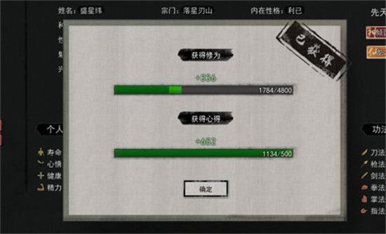 然后,由于这个宗门秘法是红色物品,加的亲密度极高,所以我们一次能加一颗星或者更多,最后我们再从妹子身上偷回来,偷的时候有可能被发现,发现了也没事,降的熟练度很低,然后反复两次就可以双修,结道侣了。
