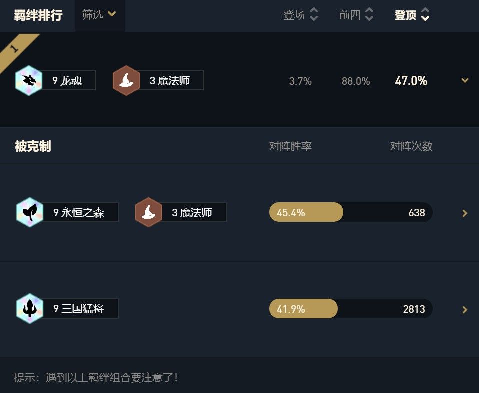最新绝活九龙魂直接占据了云顶阵容排行榜第一的阵容,吃鸡率高达47%登顶国服云顶,吃分率同时也高达88%。而在它的被克制阵容里9森林3法和9三国阵容跟九龙魂法单挑胜率只有45.4%和41.9%,连55开的资格都没有。