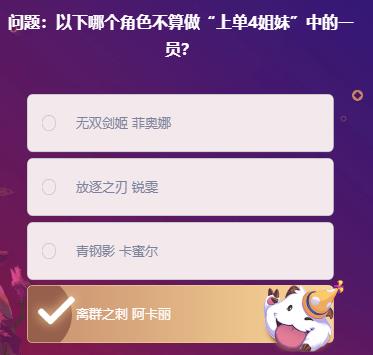 问题:以下哪个角色不算做“上单4姐妹”中的一员? 答案:离群之刺阿卡丽