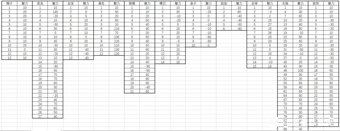 当然玩家并不用刻意追求魅力值而按固定的方法捏脸。玩家可以参考以下表格来捏出一个自己喜欢而魅力值不低的角色来体验游戏。