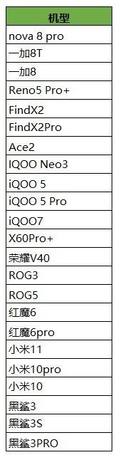 华为nova 8 Pro、一加8T、一加8、OPPO Reno5 Pro+、OPPO Find X2、OPPO Find X2 Pro、OPPO Ace2、iQOO 5、iQOO 5 Pro、iQOO 7、vivo X60 Pro+、荣耀V40、ROG 3、ROG 5、红魔6、红魔6 Pro、小米11、小米10 Pro、小米10、黑鲨3、黑鲨3S、黑鲨3 Pro。