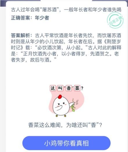 蚂蚁庄园屠苏酒谁先喝?屠苏酒在我国是一个流传了非常久的习俗的,这个屠苏酒用了很多药材泡出来的。哪么这个屠苏酒谁先喝呢?这个就一般是我们的年少者先喝,然后再是年长者。你答对了吗?下面就为大家揭晓为什么会这样。