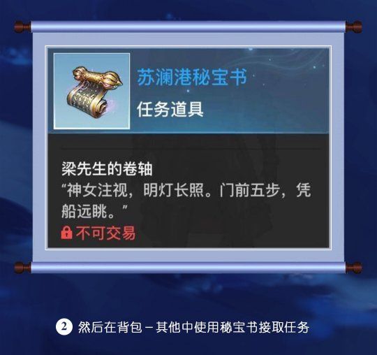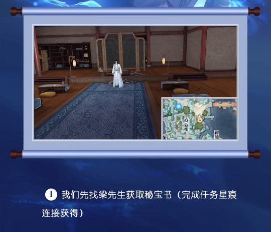 1.这种寻宝任务都是需要道具“秘宝书”才可以开启的,首先要先找梁先生获取秘宝书(完成任务星痕连接获得);