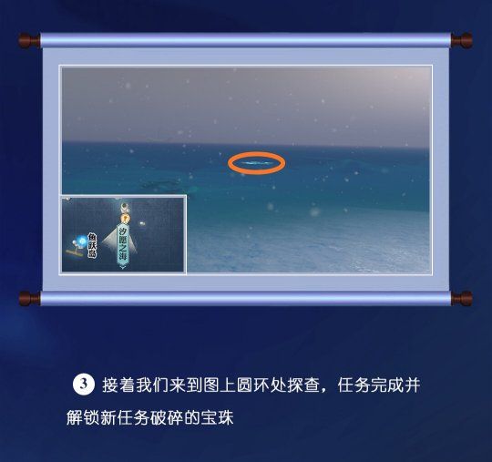 3、然后玩家来到汐愿之海(下图圆环处)探查,任务完成并解锁新任务【破碎的宝珠】。