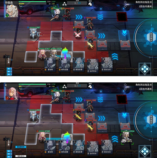 【沐子菲】的一技能“绝云突击”自带位移效果,在基因改造升级为“绝云突击A”后能够在“绝云突击A”命中敌人后再次释放“绝云突击”,在各大逃课关卡中都会用到。而“绝云突击B”则是增加防御的效果。
