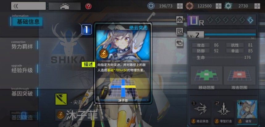 【沐子菲】是游戏开局赠送的UR角色,因为一技能“绝云突击”自带位移效果,配合移动能力能够在大多数要求“角色到达指定点”的关卡中逃课过关,是玩家必练的角色。