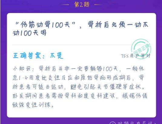 蚂蚁庄园伤筋动骨100天,骨折后必须一动不动100天吗?伤筋动骨100天是我们日常经常会说到的,意思其实也就是要好好补一补,至于是不是真的要休息100天,本站小编下面会给大家提供正确的答案选项。