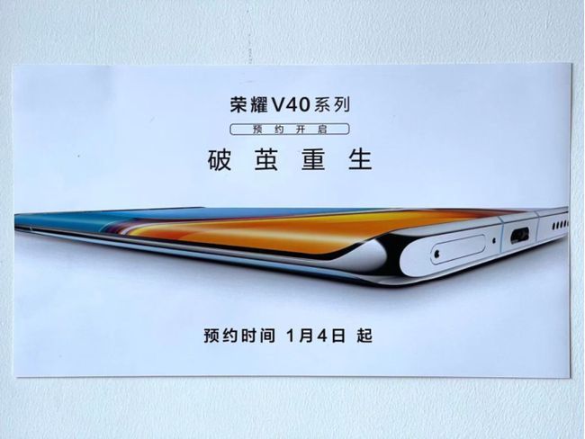 荣耀新品V40 系列机型也有了最新进展。作为荣耀正式独立后的首款机型,V40 系列的 slogan 为「破茧重生」。目前已经有线下实拍的 V40 系列海报流出。从海报来看,荣耀 V40 系列将搭载大曲率瀑布屏,这也与此前的爆料信息相符合。