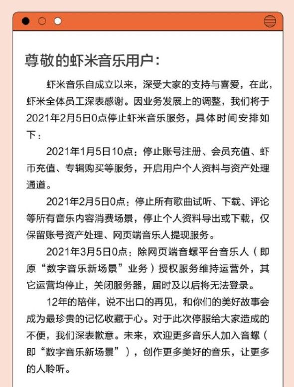 2021年2月5日0点:停止所有歌曲试听、下载、评论等所有音乐内容消费场景,停止个人资料导出或下载,仅保留账号资产处理、网页端音乐人提取服务。