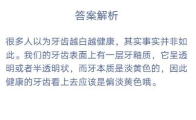 一口健康的牙齿正常颜色应该是偏淡黄色的,所以不用太纠结牙齿白不白,只要是健康的就没什么问题。蚂蚁庄园今日课堂答题答案已经分享,同学们都答对了吗?记得明天同一时间不见不散哦!